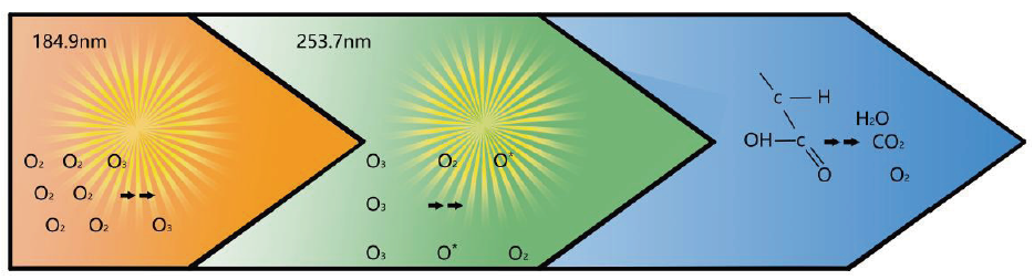 反应式:O₃ + 光子(254nm) → O₂ + O.